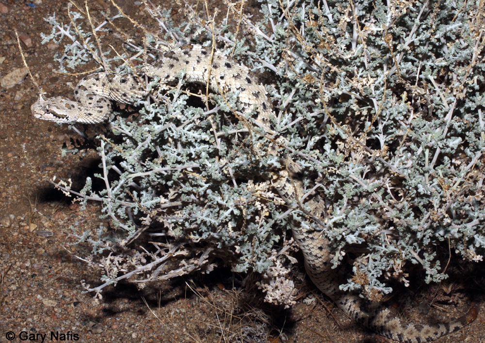 An ambush hunter, it sits buried beneath the surface of loose sand with just the top of the head showing, near kangaroo rat warrens, and lizard or rodent trails, then strikes at and releases the prey. The snake then follows the trail of the envenomated animal and swallows it whole.