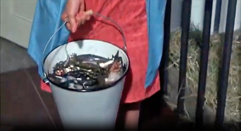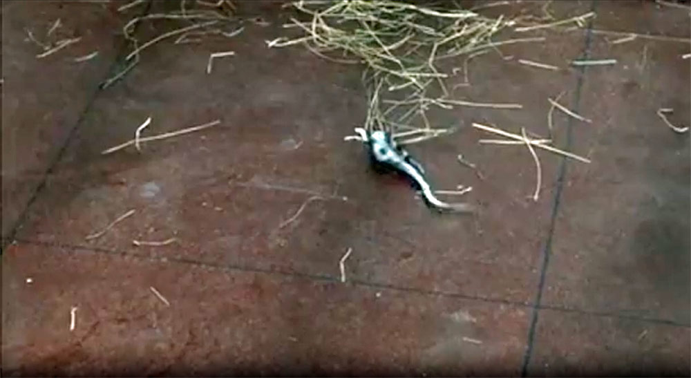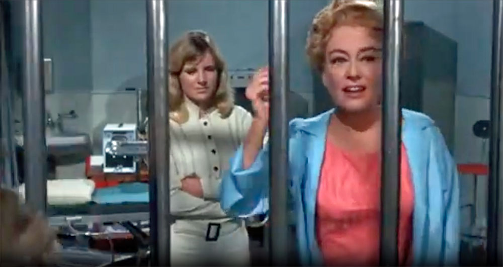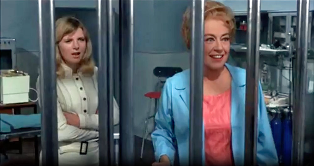 We see a scene with the anthropologist Dr. Brockton (Joan Crawford in her last feature film) and her daughter Anne (Kim Braden) as they feed Trog. We see a bucket full of fish and what appear to be rubber lizards. Dr. Brockton says Trog is not a carnivore, yet they feed him dead animals, which is the definition of a carnivore. They throw a lizard to Trog and he picks it up and eats it.