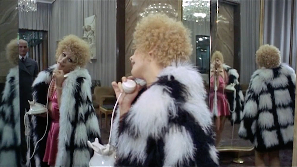 We see Zazie and others on stairs in a doorway with mirrors on each side that produce an infinity mirror effect. |