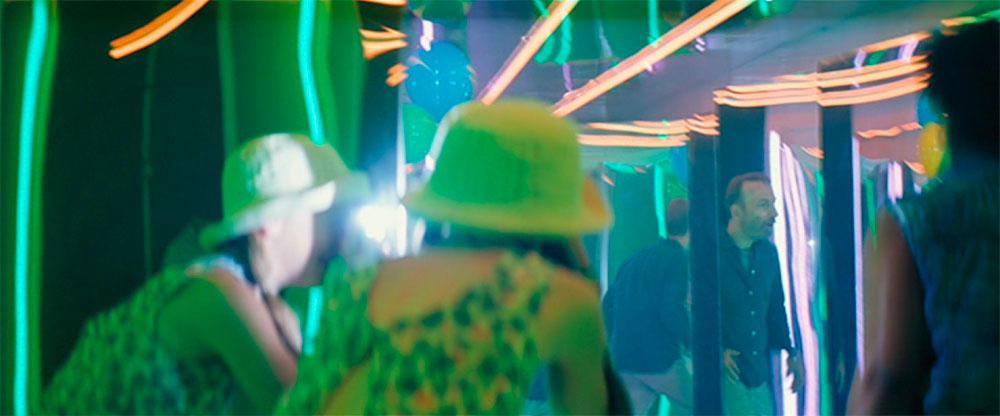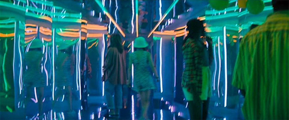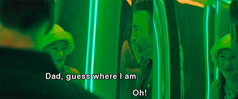 Before things get violent, we see Hutch and his daughter Sammy (Paisley Cadorath) enjoying the park. Beginning at about 32:50 they go into the funhouse and Sammy runs around hiding from Hutch in the mirror maze. We see her taking a flash picture of him and we see that picture at the end of the film just as the credits begin. This sequence explains funhouse mirrors for the poor filmgoer who doesn't know what they are so they can understand the funhouse action at the end.