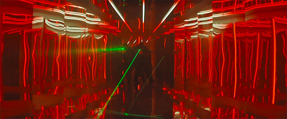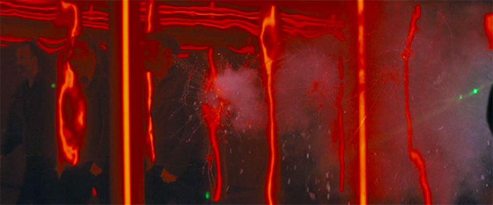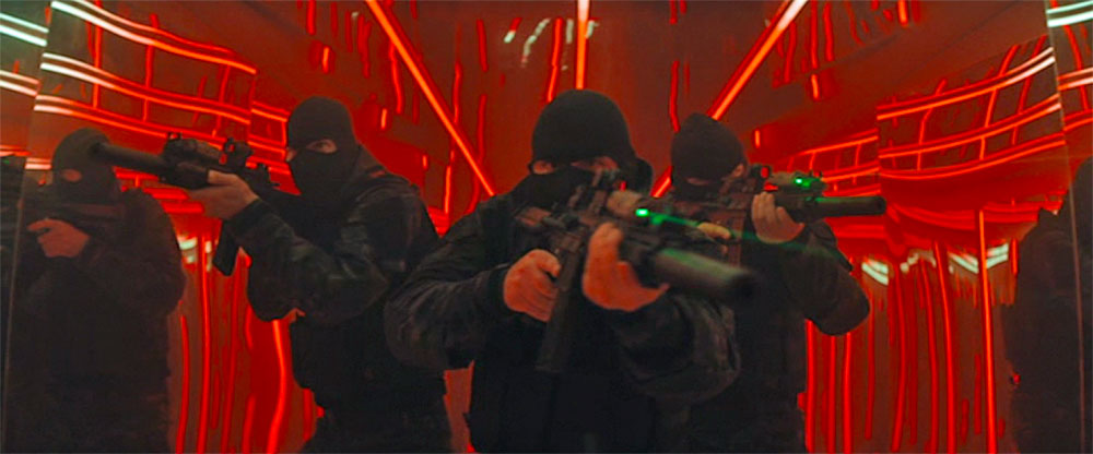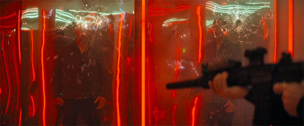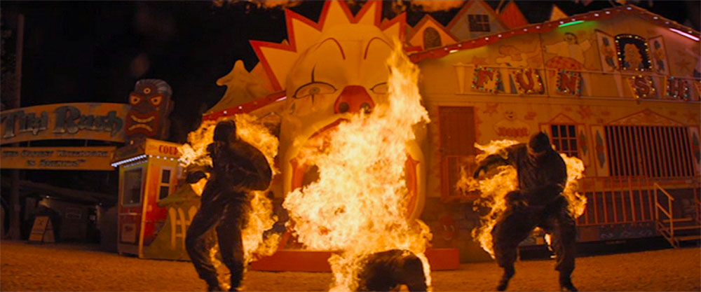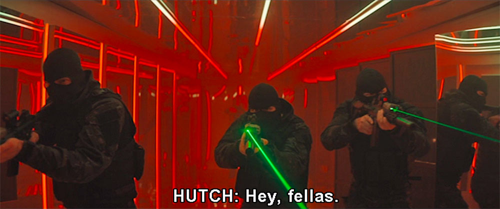 With an army of gunmen chasing them, Hutch leaves his family behind in an isolated cabin and he, his father, his brother, and the town Sheriff prepare for battle. They go to the amusement park and set booby traps for the coming fight. At about 1:09:25, Hutch runs into the funhouse mirror maze to lure some armed men inside. They follow him and shoot at his reflection in the mirrors until he gets behind them where he has planted a bomb that destroys the place, sending flames and gunmen out of the funhouse entrance clown's mouth.