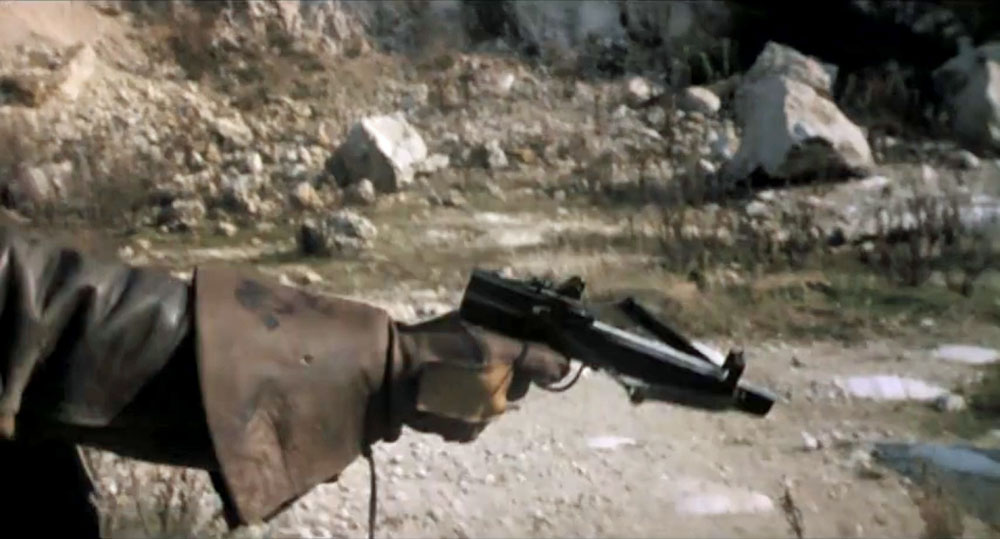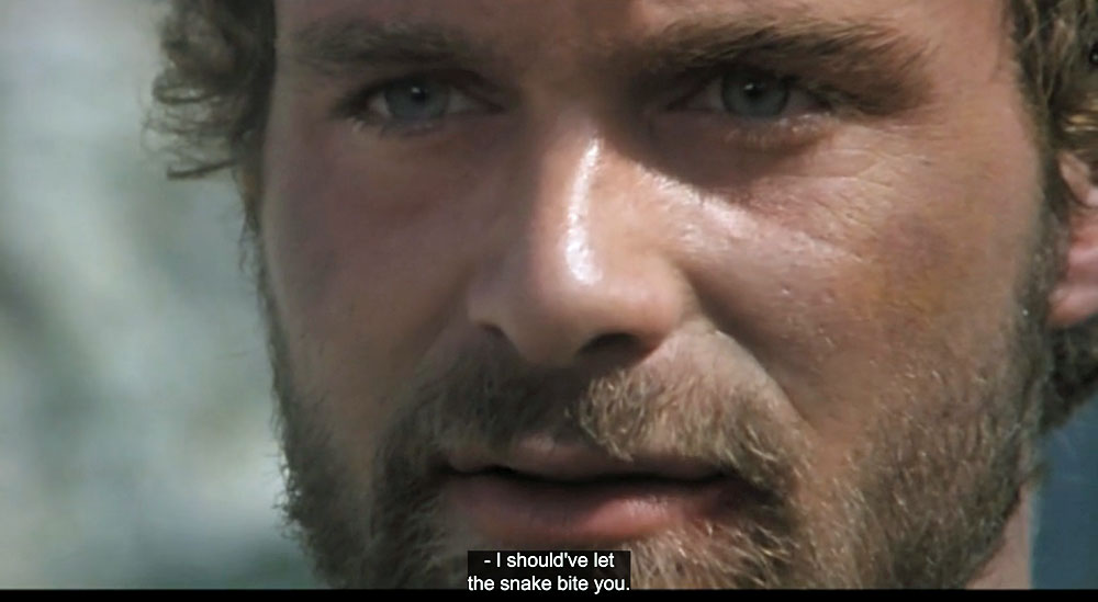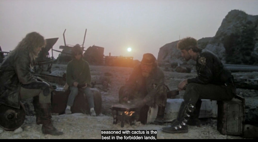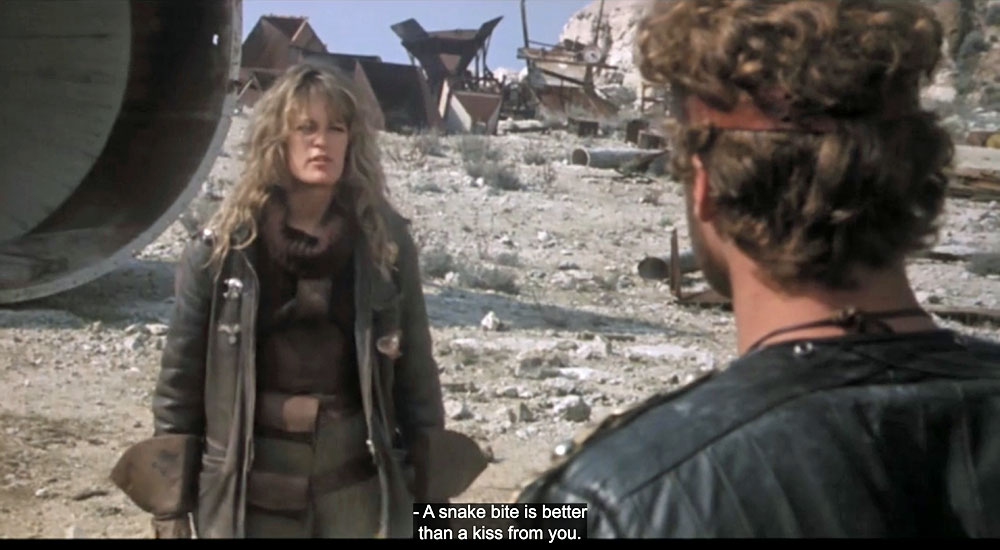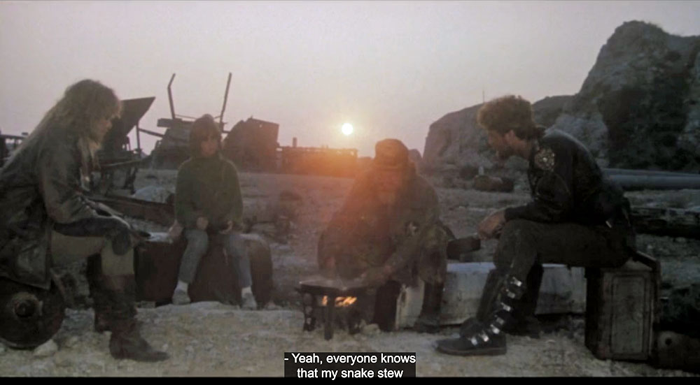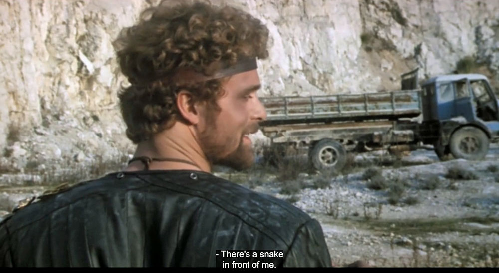 This is an Italian Mad Max ripoff made in Spain. It's set in a post nuclear-holocaust world where it never rains and water is scarce and the world is a desert full of snakes and motorized gangs.