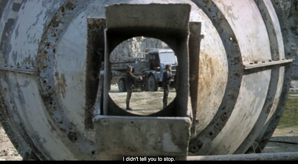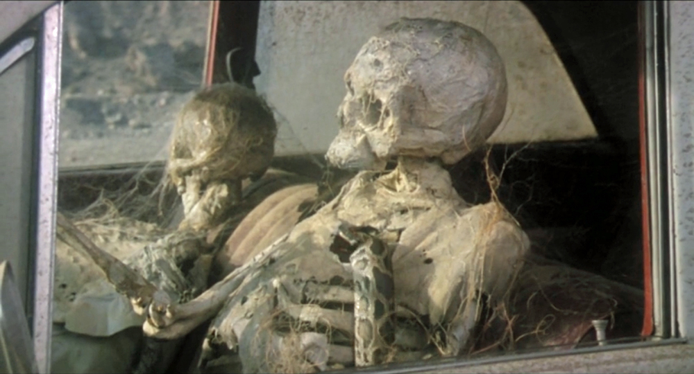 At the very beginning of the movie we see two policemen find an abandoned car and trailer. One of them investigates, pretending that he's talking to the occupants, asking for license and registration, except he knows they're very old corpses. We see a python crawling out of one of the corpses. then a man called Alien (Robert Iannucci), driving a stolen car called The Exterminator, runs them off the road to steal their water, but one of them comes back and steals his car so he give chase in the police car which he wrecks and becomes trapped inside.