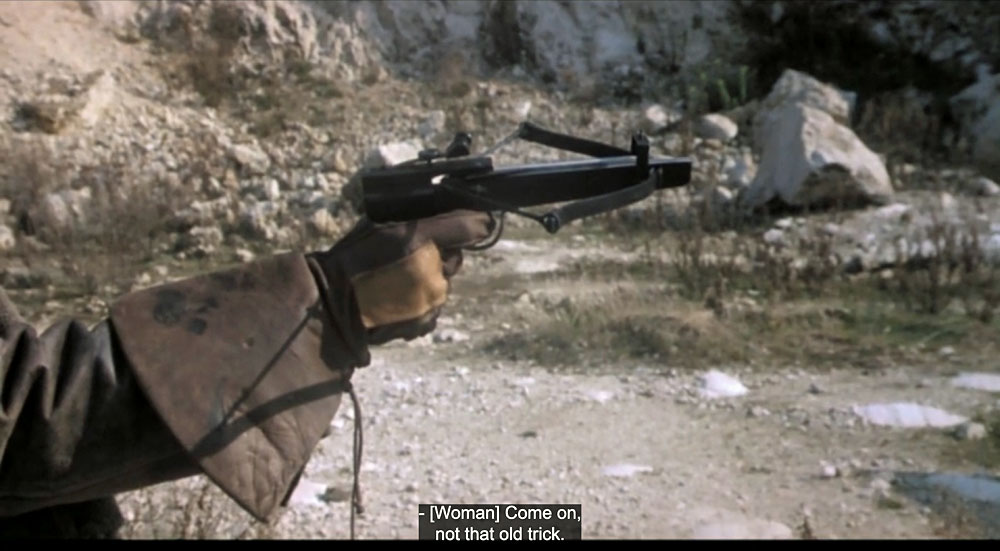 While the ex-astronaut is working on Tommy's arm, A woman shows up out of nowhere with a gun and forces Alien to walk at gunpoint. He stops, saying there's a snake in front of him. She doesn't believe him. He shows it to her and she shoots it with her crossbow pistol. Alien uses the opportunity to knock her to the ground. He pulls off her head covering to discover she's his ex-girlfriend "Trash" (Alicia Moro) who he abandoned in the middle of the desert so she's understandably angry at him. They kiss, but she uses the opportunity to kick him where it hurts. He says he should have let the snake bite her but she says a snake bite is better than a kiss from him.