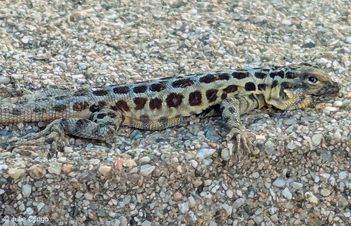 | This strange lizard observed in Temecula, Riverside County, appears to be an unusually-patterrened side-blotched lizard. © Julie Clingo. |