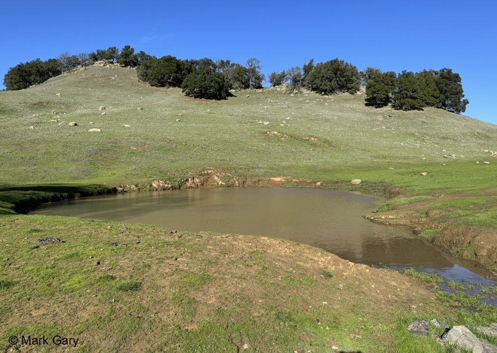 A few maturing California Tiger Salamander eggs are visible in the pond but not as many as usual for this time of year.