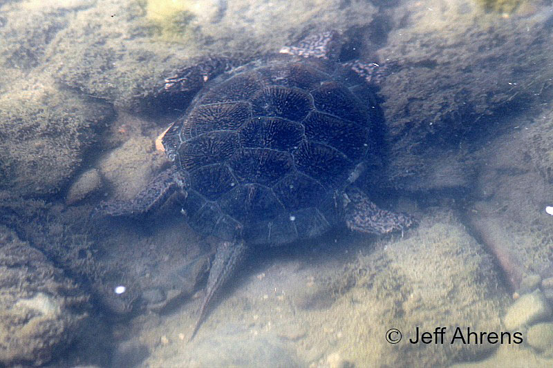 The shell shows the granular character of the natal scutes, or areolae, typical among hard-shelled turtles of all families, but only present on tiny juveniles during the spring months.