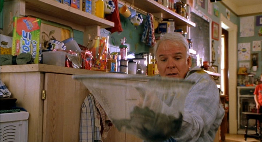 One morning Mark sees his escaped bullfrog "Beans" up on a lamp above the kitchen table where the entire family is eating breakfast. When Mark tries to catch Beans with a net, the frog falls into a large bowl of scrambled eggs which explodes onto everybody. Then Beans hops around the kitchen as kids and adults try but fail to catch him, messing up the entire kitchen, until Steve Martin finally catches him in the net. Later in the film after Beans dies they have a funeral for him and Steve Martin says he was just like a member of the family except that he was green and ate flies.