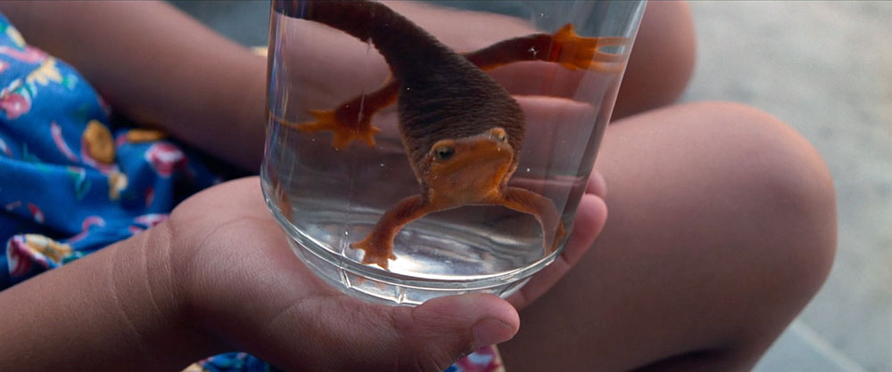 A neotenic salamander seen underwater begins the opening credits montage. |