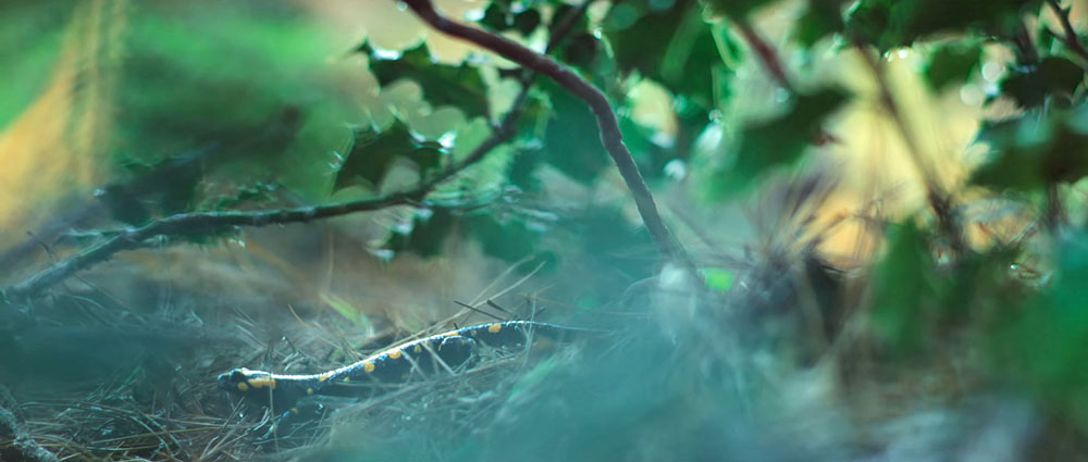 A Fire Salamander walking in the Swiss woods has a brief cameo in this French heist movie.