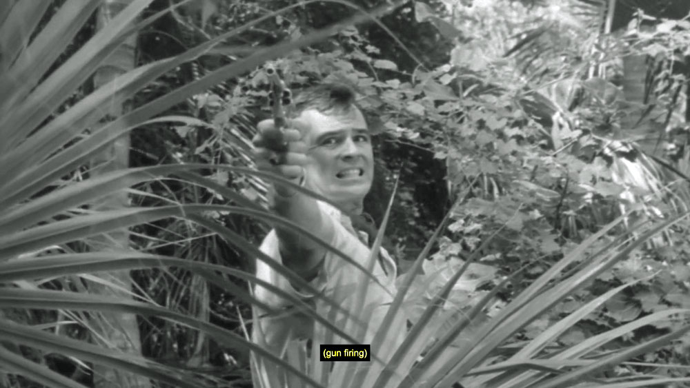After crash-landing on Voodoo Island, a man goes into the jungle to find help. He has been told there are lots of venomous snakes on the island, so when he sees some, he shoots, but misses. |
