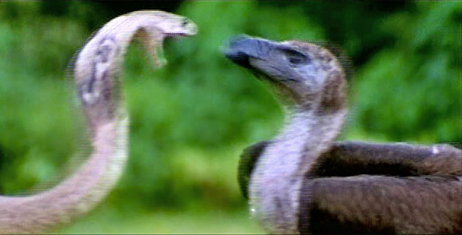 In the cave of some cannibals in Borneo, we see a snake fight a bird, just to shock us.