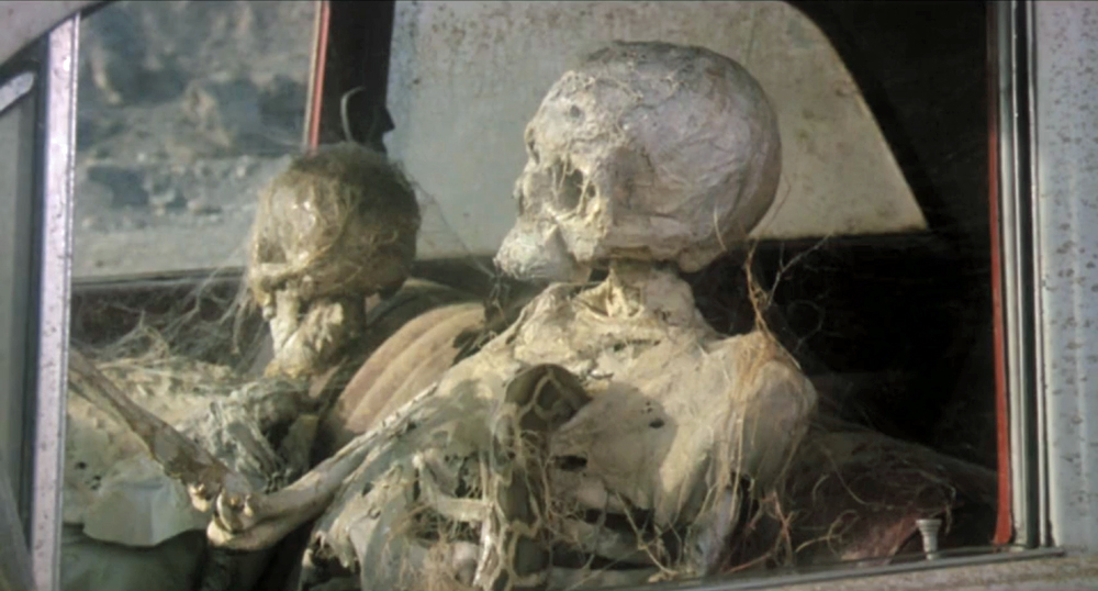 Turbo Kid opens a car door to find a snake crawling through the skull of a dead man. |