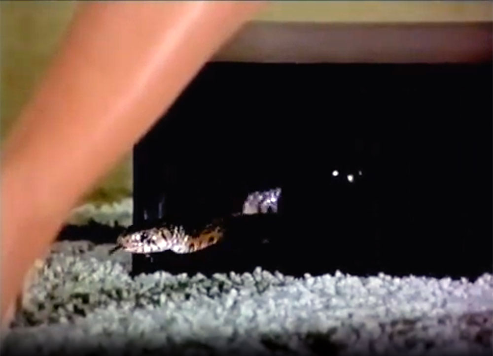 As part of his tactics to terrorize a group of gangsters who are hunting Dundee and his girlfriend, Dundee sneaks into their camp at night and throws a bag holding a large harmless python at the sentry, who was sleeping. |