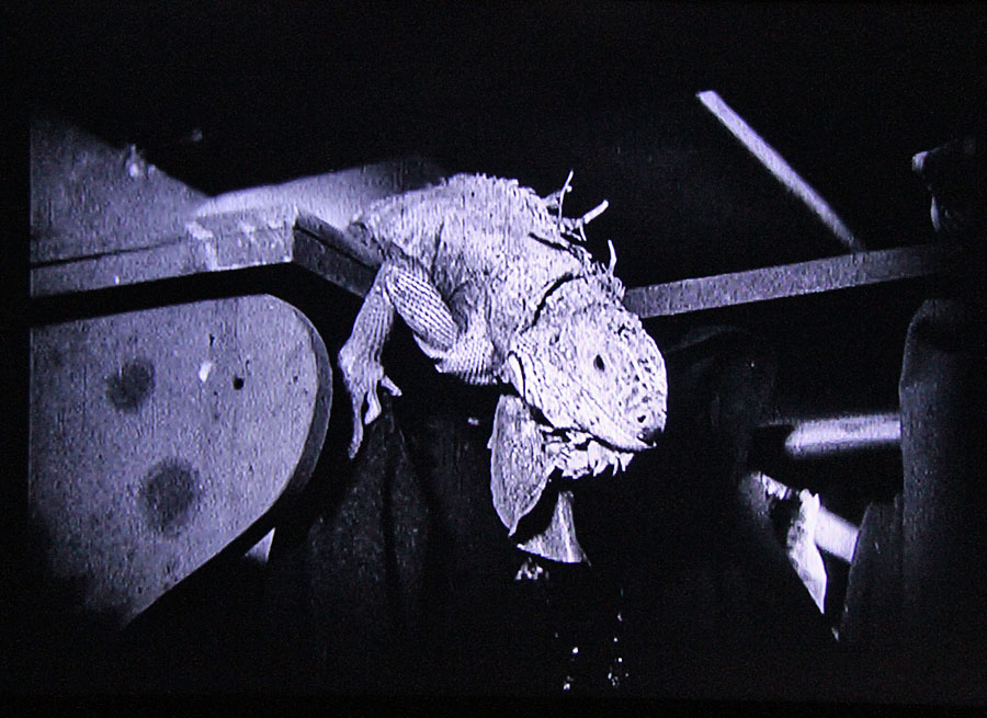 A real Green Iguana is used but it is replaced with a large rubber lizard when we see it jump into the crowd and fly through the air at people, but the effect is done quickly and is not too noticeable. |