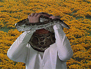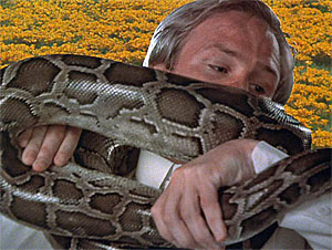 This is that psychedelic movie where a Harvard brainiac eats some Mexican magic mushrooms and gets inside an isolation tank and then freaks out so bad he turns into an ape man and eats a raw sheep. But before that, he goes into a Mexican cave with some Hinchi Indians (whose hobby seems to be balancing the biggest rocks ever) and he takes the drug for the first time. It makes him hallucinate a lot of crazy things, including some lizards and a big Burmese Python wrapped around his neck. The snake we see is a real live Burmese Python, and it really seems to be around William Hurt's neck, and, if you've ever done this with your pet Burmese, you know it can feel pretty panicky if the snake starts to tighten up, so kudos for Hurt for not dying so he could go on to get his Oscar.