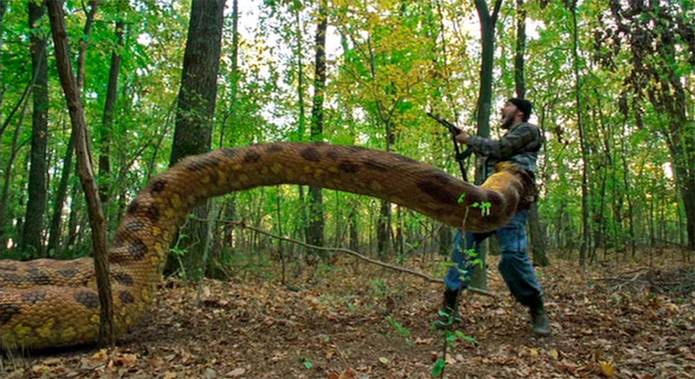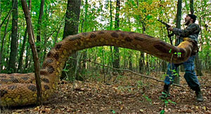 Movie monsters created in a lab usually escape and kill their maker, and that's what happens here. But Murdoch doesn't know that. He thinks his serum scientist disappeared. Murdoch pays a mercenary hunter a million dollars to find the man, the serum he has developed, and his notes. A team of mercenaries drives to the location of his lab. A group of archeologists are also in the area looking for their colleagues at a nearby dig. And a college student out for a hike wanders into the area and runs into Dr. Amanda, who has returned with a couple of police officers to try to atone for her part in creating the killer snakes. That's plenty of snake food to get the movie started, and the body count starts to grow. The snake starts eating people, and it starts growing - to 100 times it's normal size.