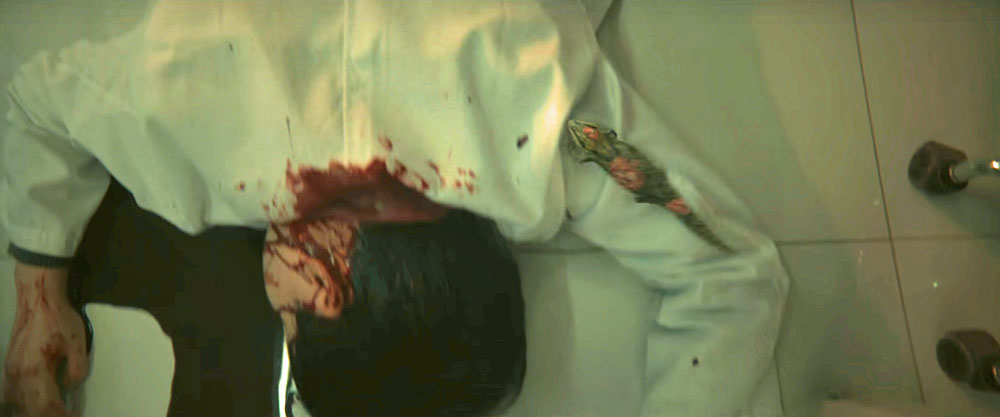 Just before the earthquake we see several escaped mutated lizards on the floor of Dr. Yang Gi-su's laboratory. One lizard has been cut in half with both halves still walking around. Another lizard crawls on the the dead body of a man in a white lab coat who has just been killed by the doctor.