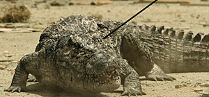 We see Choi Ji-wan, a young hunter, shoot a large crocodile with an arrow, but this only makes it mad and it charges after him. He hides in a car, and the crocodile crashes through a window, but it can't get the thick part of its body far enough inside to grab the boy. Then Nam-san (Ma Dong-seok), the action hero of the movie who can single-handedly fight off hordes of armed men, grabs the crocodile's tail and drags it out of the car. The croc tries to fight back but Nam-san chops its head off with a giant machete. Later we see Nam-san and Choi Ji-wan at an outdoor market, chopping up pieces of crocodile meat and bartering for it with hungry customers.