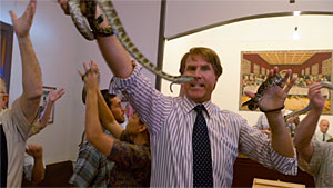 Brady tells his campaign manager Mitch (Jason Sudeikis) that he could do this all day because the snakes love him, then a rattlesnake immediately bites him on the arm. He curses in language so foul that it would embarrass a rapper. The entire congregation stands still in shock. The minister tells Brady he was bitten by the snake because he doesn't have the faith of God. Brady knows he has to turn the situation around or he won't get the snake-handler vote, so he declares that God has miraculously removed the venom from his blood and the blasphemy from his heart. Mitch and the others shout "It's a miracle!" Then we see Brady sweating profusely and acting stoned from the venom. Finally he screams, runs across the church, and jumps out a window.