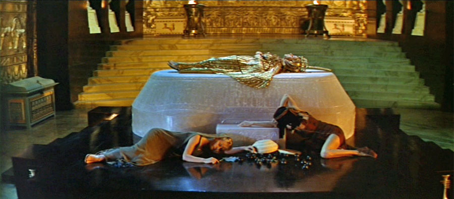 After the Romans conquer her city of Alexandria, Cleopatra (Elizabeth Taylor) the Queen of Egypt, hides in a tomb that was recently built for her. (It has a nice cobra door lock.) She sets all of her servants free except for two of her handmaidens who she asks to bring her some fruit. This is a signal for them to bring her a basket full of figs with a venomous snake in it. When Cleopatra opens the basket we can see the figs and we just barely see the snake moving around under them. But this movie version of Cleopatra doesn't pick up the snake and make it bite her on the breast like other Cleopatras. Taylor seems to wear a different (Oscar-winning) costume every time we see her (many with snake designs or accessories) and most of them are very low-cut in the front, but when she kills herself her breasts are not exposed, so maybe that's why she just puts her hand in the basket and lets the snake bite it. We see her wince, and that is the only indication that the snake has bitten her. Later when Octavius Caesar and his men discover Cleopatra's body lying ready for burial, we see the snake crawling away on the floor. Apparently, it also envenomated her two servants who lie dead below her next to the empty basket and spilled figs.
