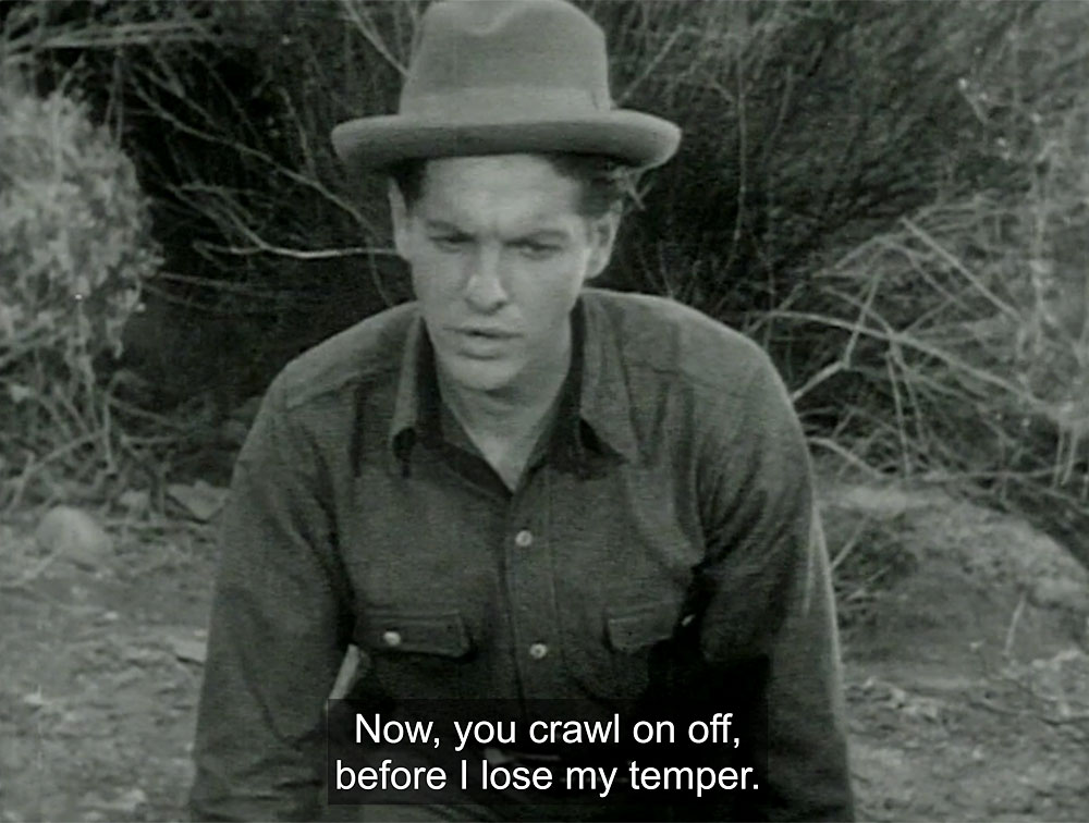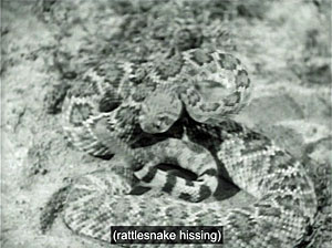 Later, after the men rescue an Indian chief who was shot by the bad guys, the Indian sends the tenderfoot out to find him a medicinal herb. He finds the plant but there's a rattlesnake next to it. He tries to shoo the snake away and then talks to it, telling the snake that he just needs a little bit of herb and then he can leave and the snake can stay, but instead, the snake strikes at him. He doesn't seem to understand that the snake is a dangerous rattlesnake as he keeps talking to it and making fun of its hissing. (Rattlesnakes don't hiss, they rattle, so it's possible the subtitles think that the rattling sounds we hear are hissing sounds.) He tells the snake that he met its relative (the gopher snake he found earlier) then reaches down to grab the snake, promising to throw it 20 feet away. But before he can get close enough to the rattlesnake that it can bite him, his partner shoots the snake, telling him: "You fool, that was a rattlesnake!) (We don't see the snake getting shot, we only hear a gunshot sound.) The tenderfoot then pretends that he knew it was a dangerous snake all along.