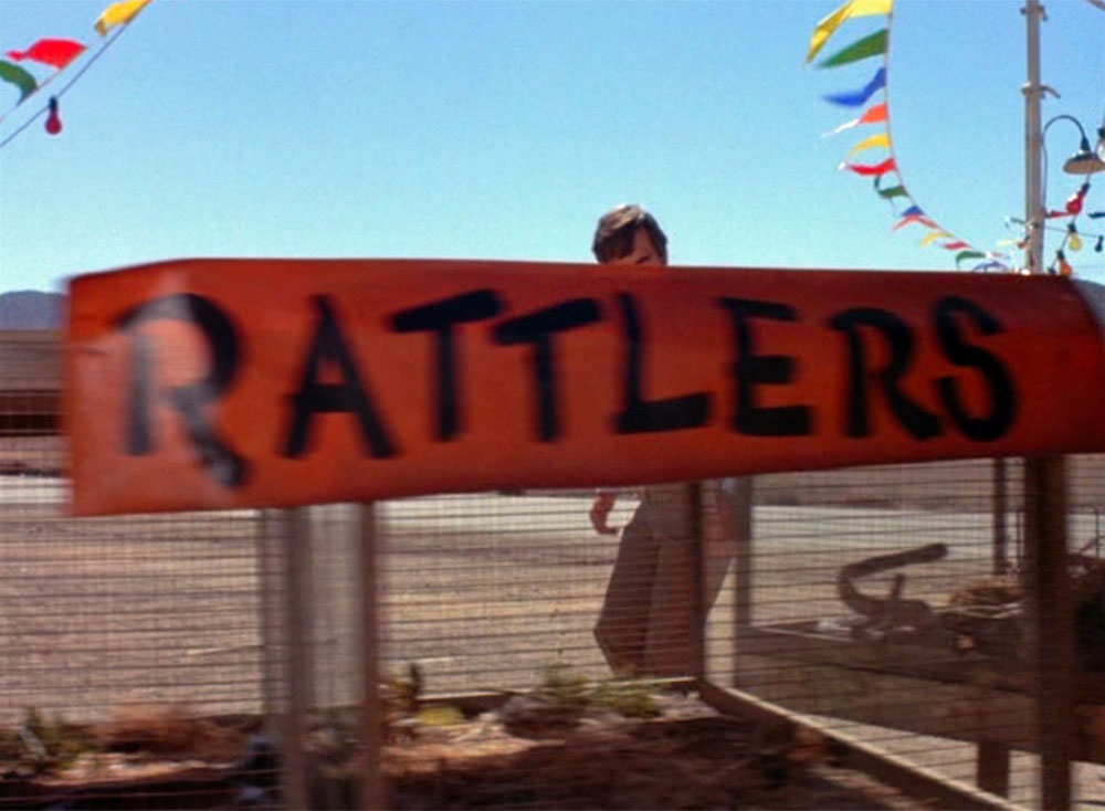 After the truck chases him for what seems like hours, Mann pulls into a small gas station to call the police. We see a sign over the gas pumps that says "Sally's Snakerama Station." On the other side of the sign it says "See the giant 8 foot rattlesnake." The budget was very low for this movie, so it's possible they used a real roadside attraction, but it would have been so cheap to make the signs and get a few cages and snakes that I suspect it was all built for the movie.