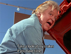 Mann asks the woman running the station where the phone is and while she checks his car, she tells him to take a look at her snakes if he has time. The snakes are in wood and wire cages on stands in the parking lot out in the sun near the phone booth. (That's a bad idea since the heat and sunlight could be deadly to the reptiles.) As Mann makes the call, suddenly the truck comes barreling towards him, crashing into the phone booth and one of the snake cages, as Mann jumps out just in time. The woman comes running, worried about her snakes. The truck circles back and smashes more cages as Mann throws a cage at him. Mann kneels down next to a rattlesnake that strikes out at him but misses, startling him as he discovers a tarantula crawling up his leg. (The woman also has a large green iguana in one of the cages and a coyote tied to a pole in her little roadside attraction.) As Mann drives away, the woman picks up a large indigo snake and continues to fret about her snakes.