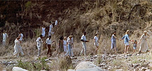 In her eulogy at his funeral, Kuki says she'll continue to see Emanuele in all the beautiful things in life - in every flower, bird, sunset, and crawling snake. Then, in a very touching and remarkable scene, she and the funeral party walk down to a creek carrying some snakes in hand and in bags, and release them all into the water along with some red flowers, including the last snake - the adder that killed him. I went to read through the book at the library to find out if this ceremony actually took place, and found that it did. It happens in the movie more or less exactly as she describes it in the book and in photographs, including a picture of the last puff adder in the stream with a red flower.
