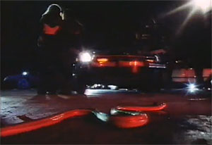 We see a few real snakes in the pet store and elsewhere, rock pythons, gopher snakes, kingsnakes, and others, along with some of the worst giant hand-puppet special-effects monster snakes you've ever seen, all shot with lighting so terrible you can barely see them.