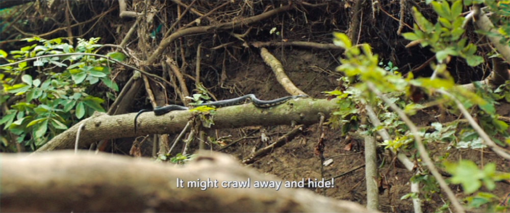 We see Soonja and the boy at the creek, where she is picking some of the minari she planted. He sees a snake crawling on a tree branch and calls to his grandmother, then throws a rock at it. She scolds him to stop because the snake might crawl away and hide and it's better to keep the snake where they can see it because things that hide are more dangerous. Then we see him drop a rock at his feet. This was a lesson for the boy that had to come up again later in the film.