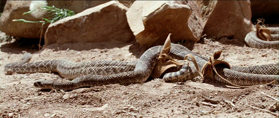 Jones' group comes upon the former camp of the witch and the others and the little girl falls to the ground screaming beneath a tree full of hanging rattlesnakes. Jones runs over but instead of shooting them he cuts the leather ties so the snakes can fall to the ground. He says something in his Indian language which the subtitles translate as "Go on now." This is a very rare example of kindness to rattlesnakes in a movie. Maybe it's part of Jones' rattlesnake bite cure. Regardless, one of the snakes strikes at him and he jumps back. (There must be a law that rattlesnakes have to strike at someone whenever they are used in a movie.) Jones tells them the man who used the snakes was a Brujo, a witch: "Snakes belong on the ground. This one hangs them in the air."