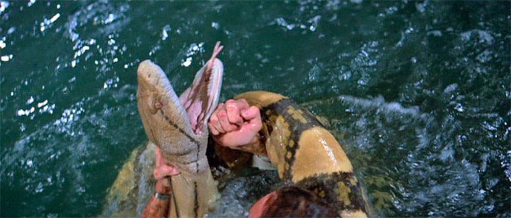 Bond flies to Brazil where he escapes from a speedboat as it sails over a waterfall, hang gliding to safety. He follows a woman into an ancient temple that leads to an underground building, stopping next to a pool with a waterfall. He stands on a large stone as several of Drax's women appear and stand around the pool like models in a photoshoot. Then the stone tilts, dumping Bond into the water. He is startled to see a large python in the water. He swims to the edge and tries to get out, but the snake grabs him, wrapping itself around his body. Bond wrestling with the python is intercut with close-ups of the women's mildly amused faces as they watch the struggle. (I don't know why their perspective matters here. They're probably just more interesting to look at than the silly fake snake-wrestling.) We see a pen in Bond's shirt pocket which he takes out and extends a long needle. (He must have stolen Holly's pen.) He sticks the needle into the snake's neck then leaves the python in the water. He swims to the edge of the pond where he is met by his nemesis Jaws, followed by Hugo Drax and his henchmen. Drax scolds Bond for once again thwarting his plan to kill him in an amusing way. Drax then asks Bond a very stupid question - why did he break off the encounter with Drax's pet python? (In other words - why didn't he let the snake kill him?) Bond replies with one of the many terrible puns used in the movie - "I discovered he had a crush on me."
