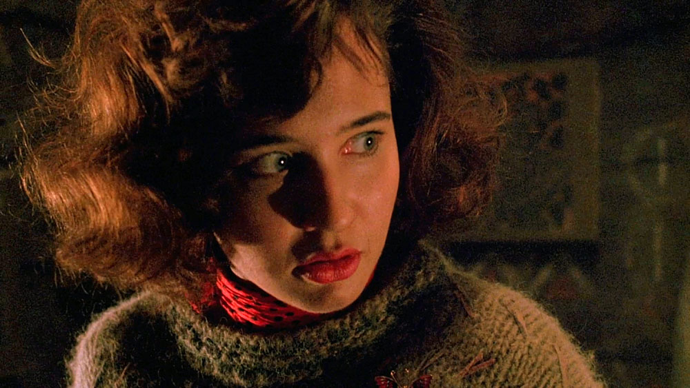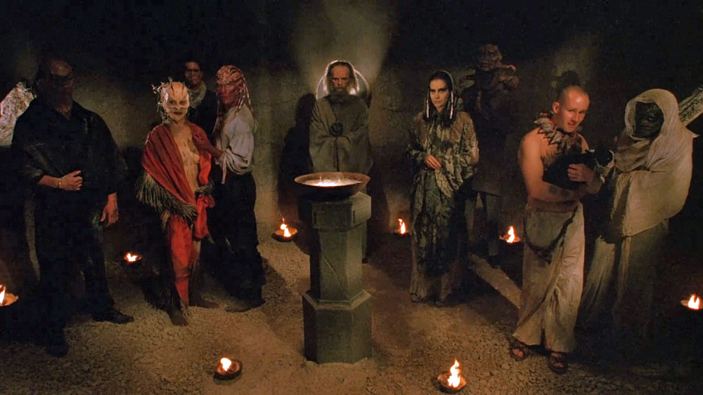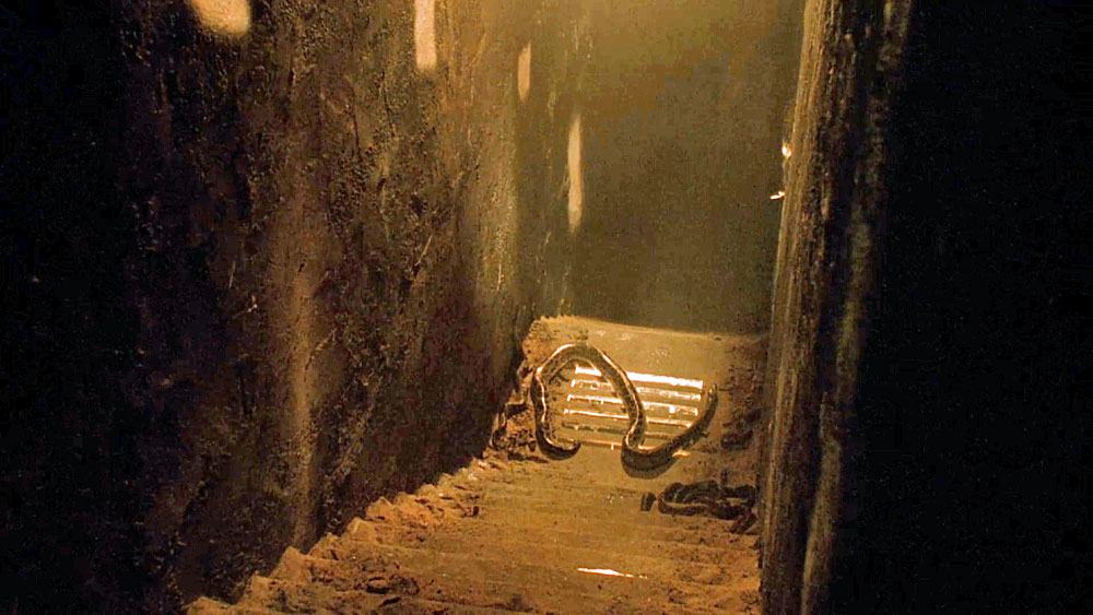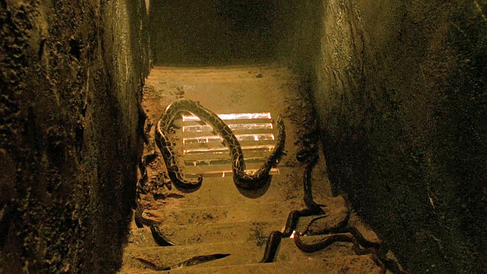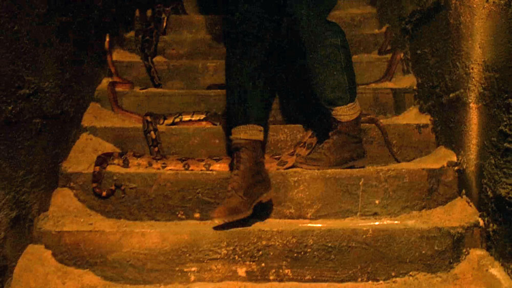 The nightbreed live underneath an isolated graveyard in rural Canada called Midian, to hide from humanity, who they call "naturals" or "meat," and because most of the nightbreed will die if exposed to sunlight. When a young woman named Lori (Anne Bobby) comes to Midian to search for her boyfriend Boone (who was bitten by one of the nightbreed then killed by the police which turned him into a nightbreed) she walks down some old dark stairs covered with snakes to get to where the nightbreed live underground. She has to tiptoe over snakes lying on the steps and climbing on the walls. It's rare to see this in a movie, but she walks through the snakes without screaming, or trying to kill them, or even looking scared. She doesn't flinch much either when she sees the nightbreed which are considerably more frightening. Later we see another shot of the snakes on the stairs for no particular reason.
