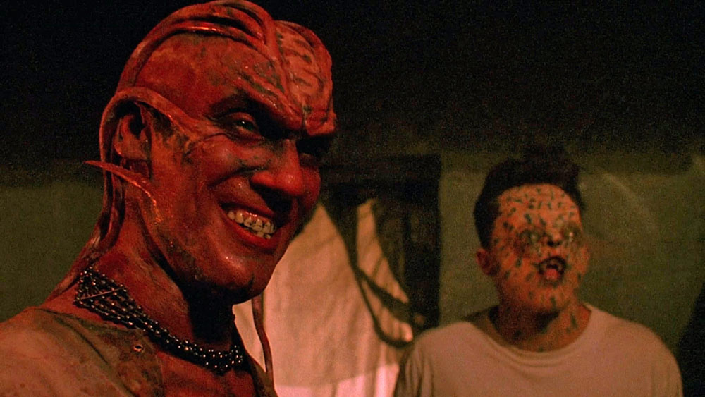 The movie introduces us to a community of misunderstood mutant outcasts called the nightbreed, who are described as the last survivors of the great tribes of shapeshifters, freaks, and berzerkers, the remains of races that the human tribe has almost driven to extinction. The nightbreed vary from vaguely human in appearance to horrifying mutations, and the makeup and costuming of the nightbreed is maybe the best part of the movie. At the end, angry armed soldiers, law enforcement officers and red-neck hunters try to exterminate the nightbreed once again. These armed human monsters, who include a respected psychiatrist who is also a serial killer slasher, are more frightening than the nightbreed.