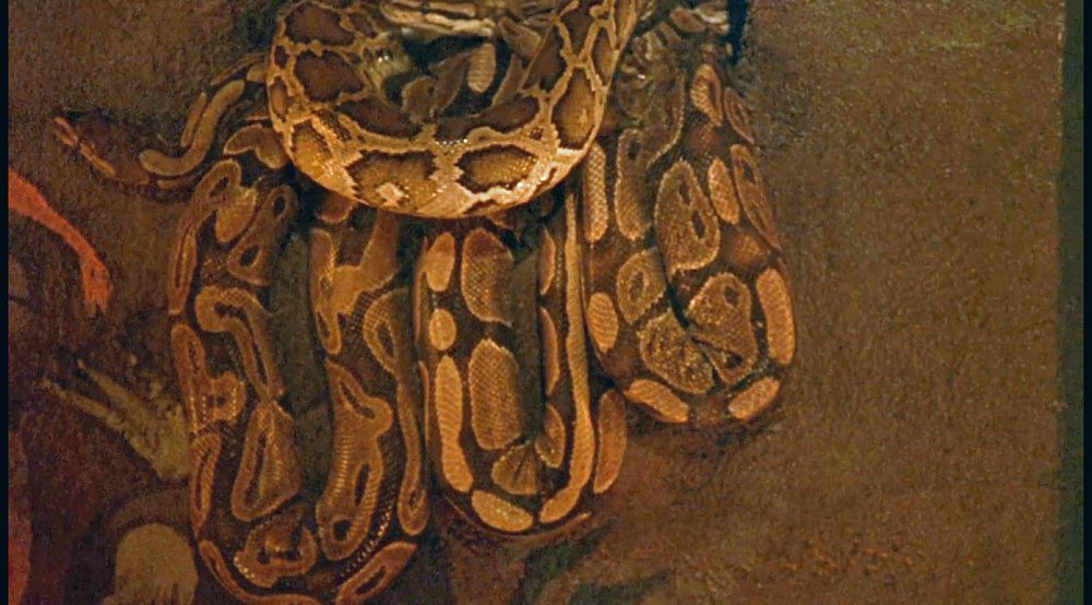 Why all the snakes? Probably because snakes are creepy and scary and so are the nightbreed. And because live snakes are easy to get and the kind of snakes they used here don't move very fast so they can be easily used as background scenery, like living Halloween decorations. It's hard to see all the snakes in the dark, but most of them appear to be harmless snakes you can buy in most pet stores - Burmese Pythons, Boa Constrictors, and Ball Pythons.