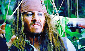 As they are wading through waist-high water in a jungle swamp, Anjelica explains to Sparrow that the ritual takes two people. Both chalices get water from the fountain, but only one gets a fresh tear from a live mermaid. The person who drinks the water with the tear becomes eternally young and the person who drinks the plain water dies. Then they see a snake swimming in the water. Angelica quickly grabs it and continues her explanation. As she tells Sparrow that the person in the ritual who lives gets all the life of the person who dies, she holds the snake inches from his face in a teasing threat as if she plans to kill him right there, but instead she turns around and throws the snake away. (There wouldn't be any more sequels without old Captain Jack.) It's obvious their relationship never was very healthy, and that is proven again at the end when one of them abandons the other on a deserted island.