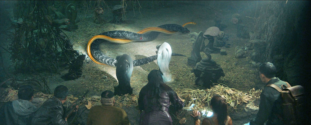 Most of the snakes we see, including the giant snakes, are computer-generated animations, but there are a few real snakes.,including a small green snake on a bush, and the hatchling Zhaohua.