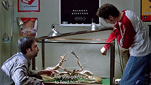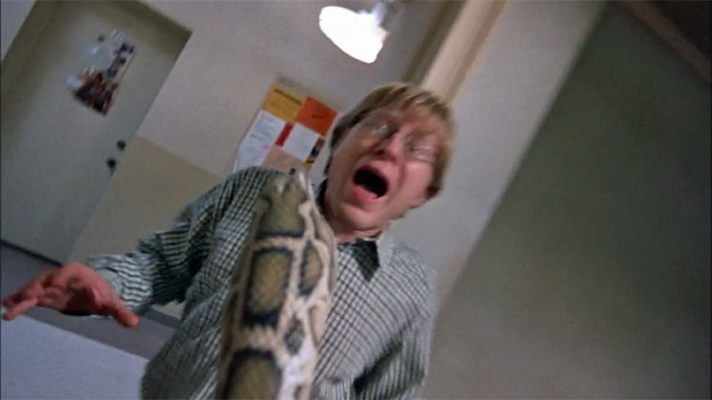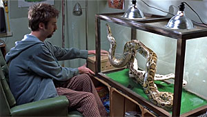 The main feeding scene is one of the funniest snake scenes I can remember. It's preceded by a couple of short scenes in which Barry talks to a box full of mice, telling them one of them is going to die. Then he talks to Mitch, and finally tosses a mouse into his cage and tells the snake to "unleash the fury!" But Mitch is not interested.