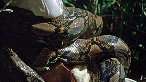 I have to give the movie credit for having one of the most bizarre/boring snake fight scenes I've seen. The snake is a Reticulated Python, but it appears that maybe two different snakes were used, maybe even two different species, but it's all a blur. You can watch the scene for yourself on YouTube if it's still there.