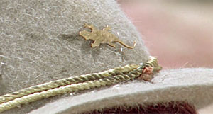 In case you don't know, a Hellbender is a huge aquatic salamander found in streams in eastern North America. All we see in the movie is a few representations of Hellbenders: one is painted on the back of a wooden coach; there are Hellbender insignias on belt buckles; and ex-Confederate soldiers have a gold Hellbender insignia pinned to their hats. (After a brutal ambush, Colonel Jonas slaps one of his sons around because his Hellbender pin fell off his hat at the crime scene, which would have been evidence against them if the law found it. The Hellbenders regimental flag, which is draped over the coffin full of cash, also has a large Hellbender sewn on to it.