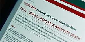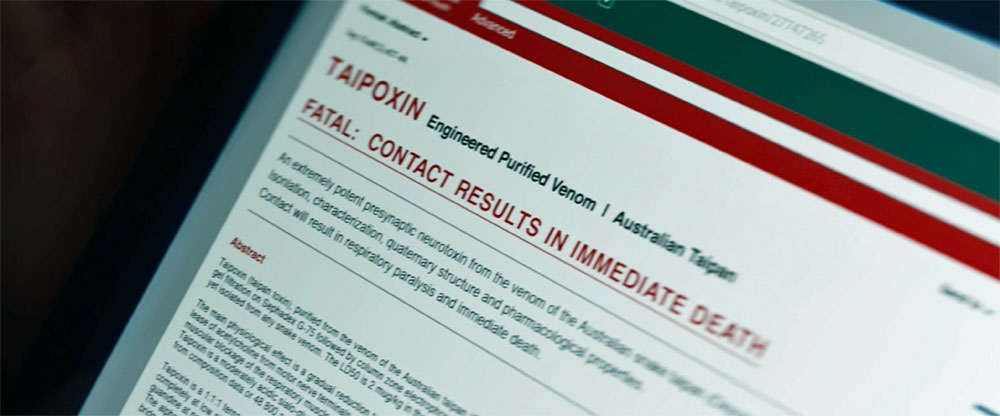 I figured if a junky/prostitute/assassin can Google Taipoxin, I can too. I learned that it's a real thing. It's described as the most lethal neurotoxin isolated from any snake venom to date. You can buy it freeze-dried online for a few hundred bucks, but it doesn't seem to be sold in a clearly-labelled giant syringe for use by terrorists and assassins. I'll bet it doesn't take very much Taipoxin to kill someone, so there's no reason the syringe would be so enormous. It probably needed to be big enough in the movie that we could read the label, and a giant syringe certainly makes a much better movie weapon.