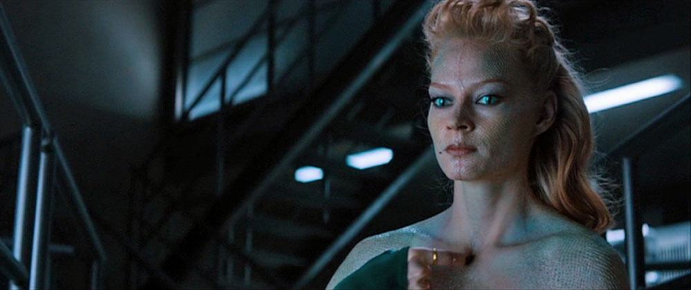 Best of all, in the final fight, we see Viper shot by an arrow and fall several stories, which makes her skin change to snake skin and her eyes turn green. She pulls the arrow out, then picks herself up and scratches a line down the middle of her face with her claw and then rips the skin off her entire head, finally tearing off her long blonde hair. Bald as a doorknob she fights another woman and spits her venom at her and at Logan. She appears to be killed in the end, but typical of the genre, we don’t see her dad for sure. Just in case somebody decides to give her her own movie one day. I’d watch it.