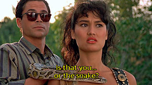 Tia Carrera plays a singer in a rock band who is making a music video for Rob Lowe's character. She and the band are playing their instruments while dressed like cavemen in a tropical setting next to a waterfall. Carrera has a Burmese Python wrapped around her neck, but the snake is so heavy it keeps falling off her shoulders. She complains, then takes a break and gives the snake to Lowe to hold. She just broke up with Wayne and was beginning to fall for Lowe's sleazy rich yuppy charm, but when she realizes that she can't tell the difference between Lowe's cold touch and the cold-blooded snake, she runs back to Wayne.