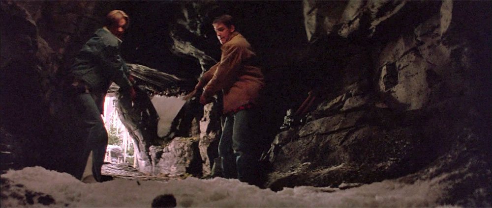 Sure enough, once they get past the snakes, they find a group of bears sleeping in a large open area in the cave, and they wake them up. The bears attack the boys, and as they run towards the exit they see the snakes again and stop, because all the snow has melted. In fear for their lives, figuring their chances are better with the snakes than with the bears chasing them, they run through the rattlesnakes as we hear all sorts of rattling sounds and the snapping sounds of the snakes striking at them. They don't get bitten, and even more surprising, the bears don't keep coming after them.