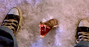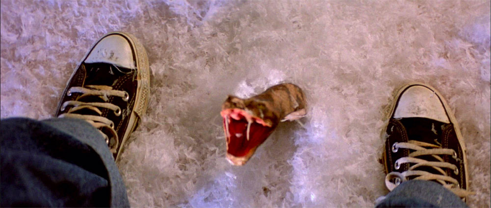 As the boys walk over the snakes and the snow we see several rattles sticking up out of the snow shaking, as we hear rattling sounds. One of the snakes pops up out of the snow between the youngest boy Marshall's legs and he screams, then he jumps straight up after the snake strikes up at him. Marty chastises him for screaming, which could wake the bears and kill them all.