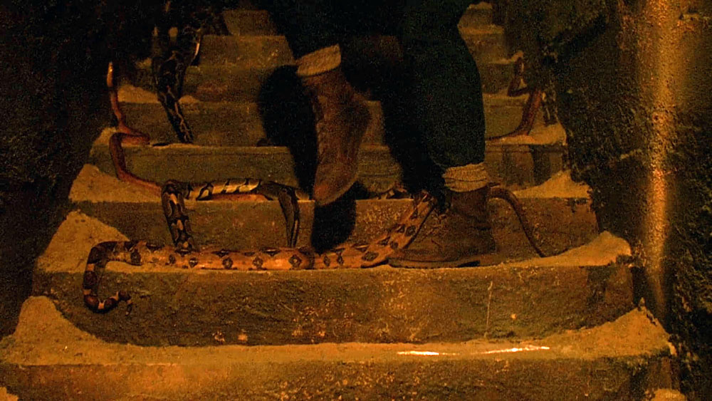 Snakes are on the attack in several scenes in this jungle adventure movie. |