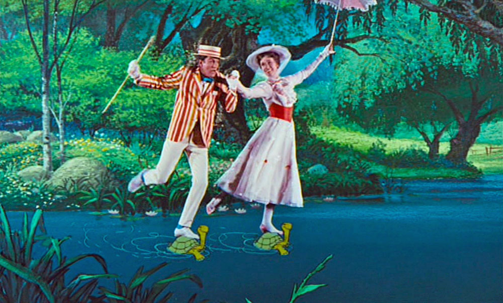 Mary and Bert are ferried across a pond on the backs of two talking turtles.