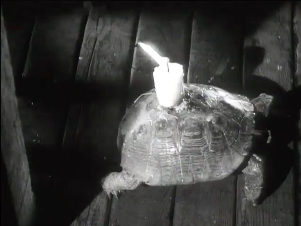 A turtle with a candle stuck to its back is seen walking around a haunted ship. |