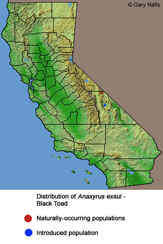 Black Toads were also introduced to Batchelder Spring on the west side of Westgard Pass but the population is thought to be extinct. (Macey and Papenfuss, Natural History of the White-Inyo Range Eastern California, 1991, edited by Clarence A. Hall Jr.) |
